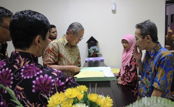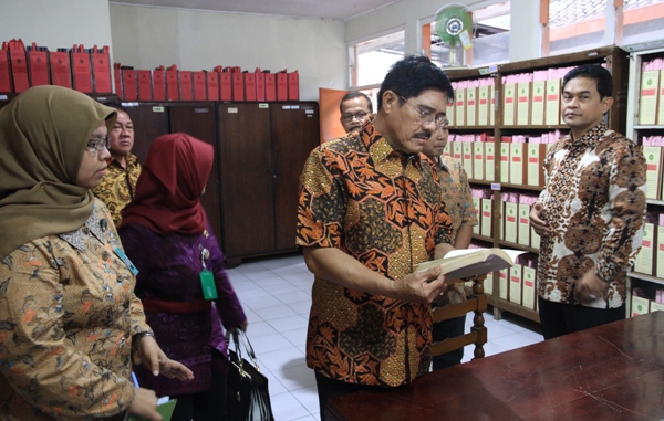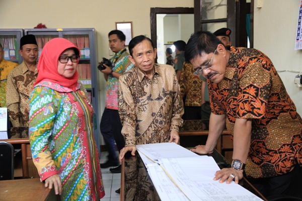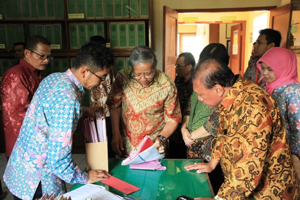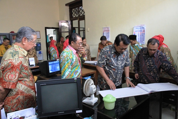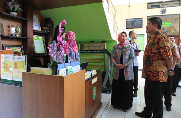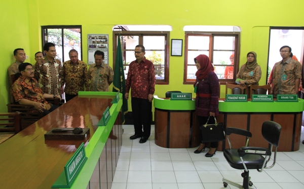 Semarang – Humas : Jum’at, 9/9/2016, Ketua Mahkamah Agung Prof. Dr. H. M. Hatta Ali, SH., MH bersama dengan Wakil Ketua Mahkamah Agung Bidang Yudisial dan Non Yudisial beserta Dirjen Badan Peradilan Umum, Dirjen Badan Peradilan Agama melakukan kunjungan kerja ke wilayah Jawa Tengah, tepatnya di Pengadilan Negeri Temanggung, Pengadilan Agama Temanggung, Pengadilan Negeri Wonosobo dan Pengadilan Agama Wonosobo. Dalam kunjungan ini Pimpinan MA melihat Meja informasi dan pengaduan, buku register perkara, arsip perkara, perpustakaan dan tempat sidang anak.