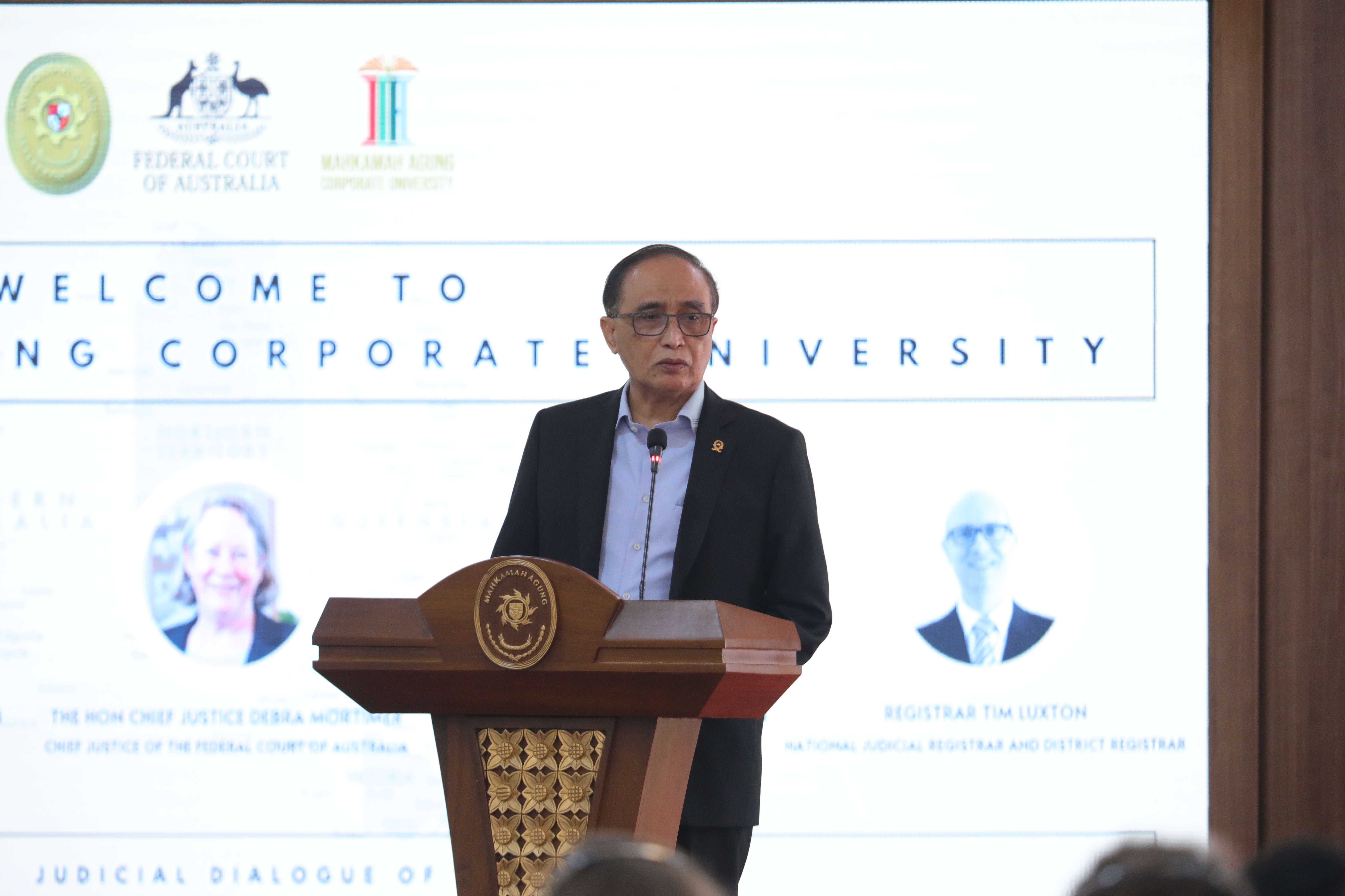 Setelahnya, Ketua Mahkamah Agung menyampaikan sambutannya yang menegaskan bahwa pertemuan ini bukan hanya sekadar pelaksanaan dari perjanjian kerja antara Mahkamah Agung dan FCA yang telah berlangsung selama dua dekade belaka. Namun juga sebagai forum dan ruang refleksi bagaimana peradilan di Indonesia dan Australia dapat tetap tegak sebagai pilar keadilan di tengah dunia yang semakin terhubung, penuh tantangan, dan bergerak cepat.