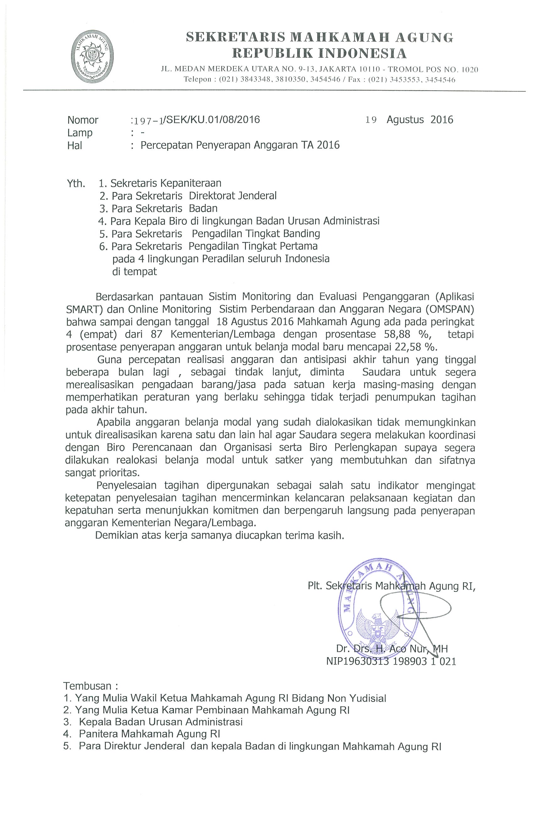 Jakarta-Humas, Berdasarkan pantauan sistem online Monitoring dan Evaluasi Penganggaran (Aplikasi Smart) dan Online Monitoring Sistim Perbendaraan dan Anggaran Negara (OMSPAN) bahwa sampai dengan tanggal 18 Agustus 2016 Mahkamah Agung RI ada pada peringkat 4 (empat) dari 87 Kementerian/Lembaga dengan Prosentase 58.88 %, tetapi Prosentasi penyerapan anggaran untuk belanja modal baru mancapai 22.58 % . Surat yang ditujukan kepada Sekretaris Kepaniteraan, Sekretaris Dirjen, Sekretaris Badan,Para Kepala Biro di lingkungan BUA, Sekretaris Pengadilan tingkat banding, Sekretaris Tingkat Pertama pada 4 (empat) lingkungan Peradilan diseluruh Indonesia. Berikut kami sampaikan Suratnya. (sf/rnd)